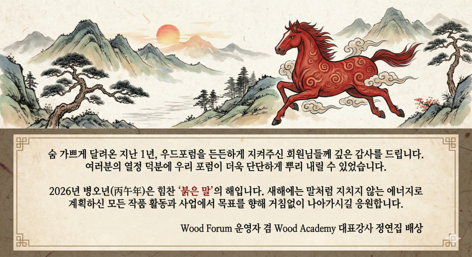 새해인사 Date2025-12-31 View 40 menu 본문 이전글 등록된 게시물이 없습니다 다음글 우드 아카데미 맞춤형 대면교육 공지 목록 댓글목록 댓글목록 등록된 댓글이 없습니다.