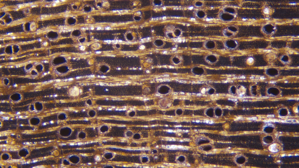 산공재. 관공의 크기는 큰 편으로 고립 및 방사 복합. 타일로시스 존재. 축방향유조직은 주위상, 익상, 연합 익상. 방사조직의 폭은 넓고 간격은 보통에서 넓은 편임.