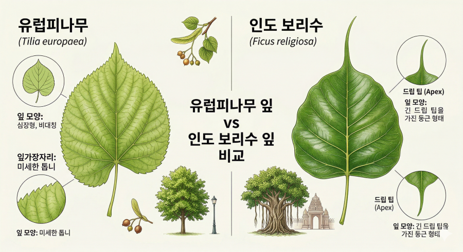 반면, '보리수(菩提樹)'는 원래 불교의 상징적인 나무입니다. 석가모니가 그 아래에서 깨달음을 얻은 나무로 알려져 있으며, 이 나무의 진짜 정체는 뽕나무과(Moraceae) 무화과속(Ficus)에 속하는 열대 식물인 인도보리수(Ficus religiosa)입니다.