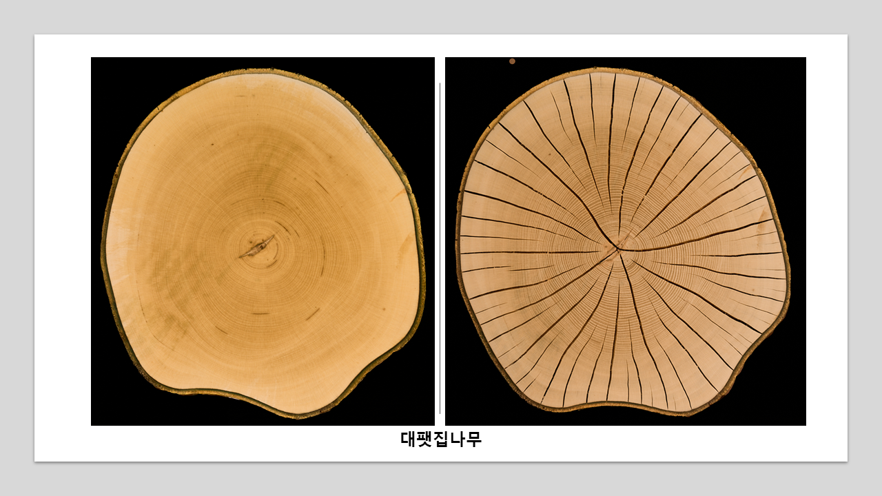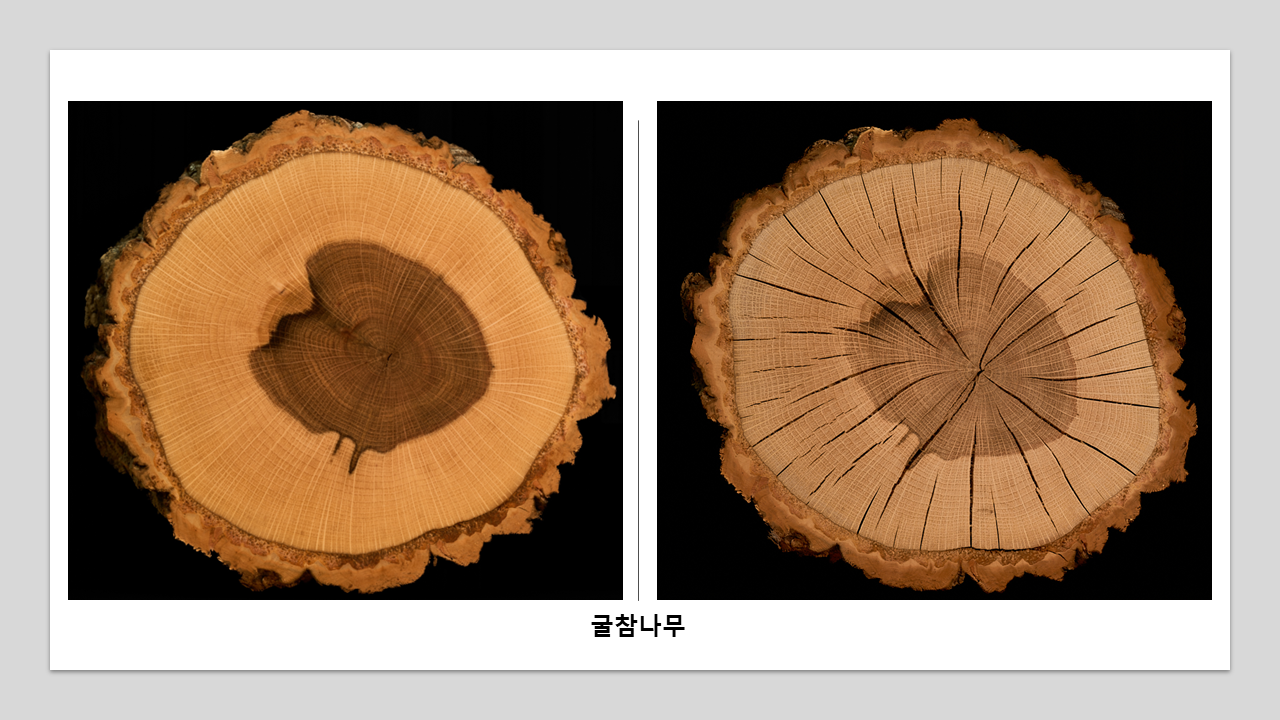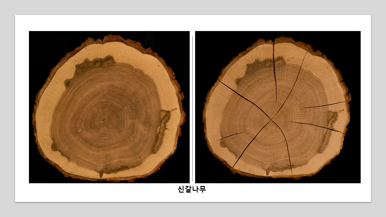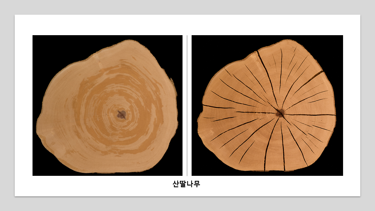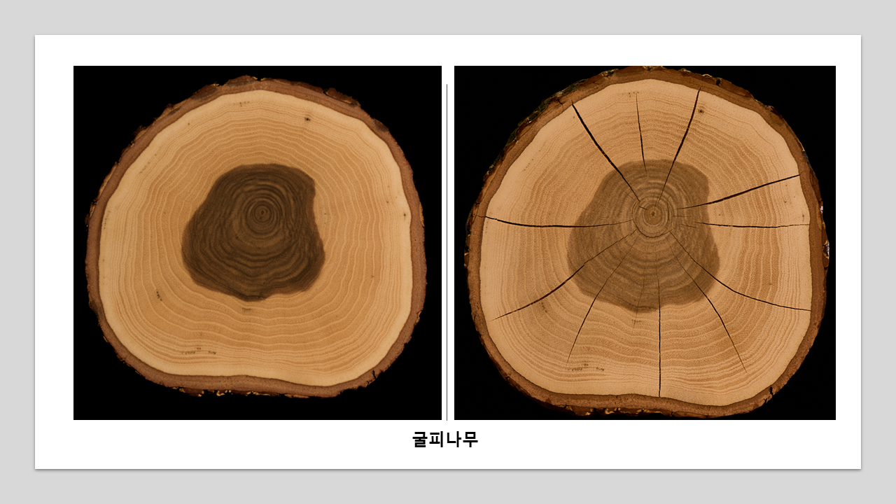 국산재의 원판 사진을 촬영하면서 관찰한 자료를 첨부한다. 원판은 생재를 샌딩하여 촬영하고 1주일이 경과한 후 할렬이 발생한 동일 원판 사진이다.