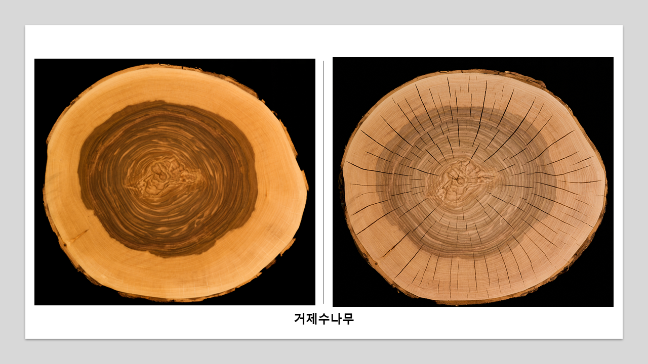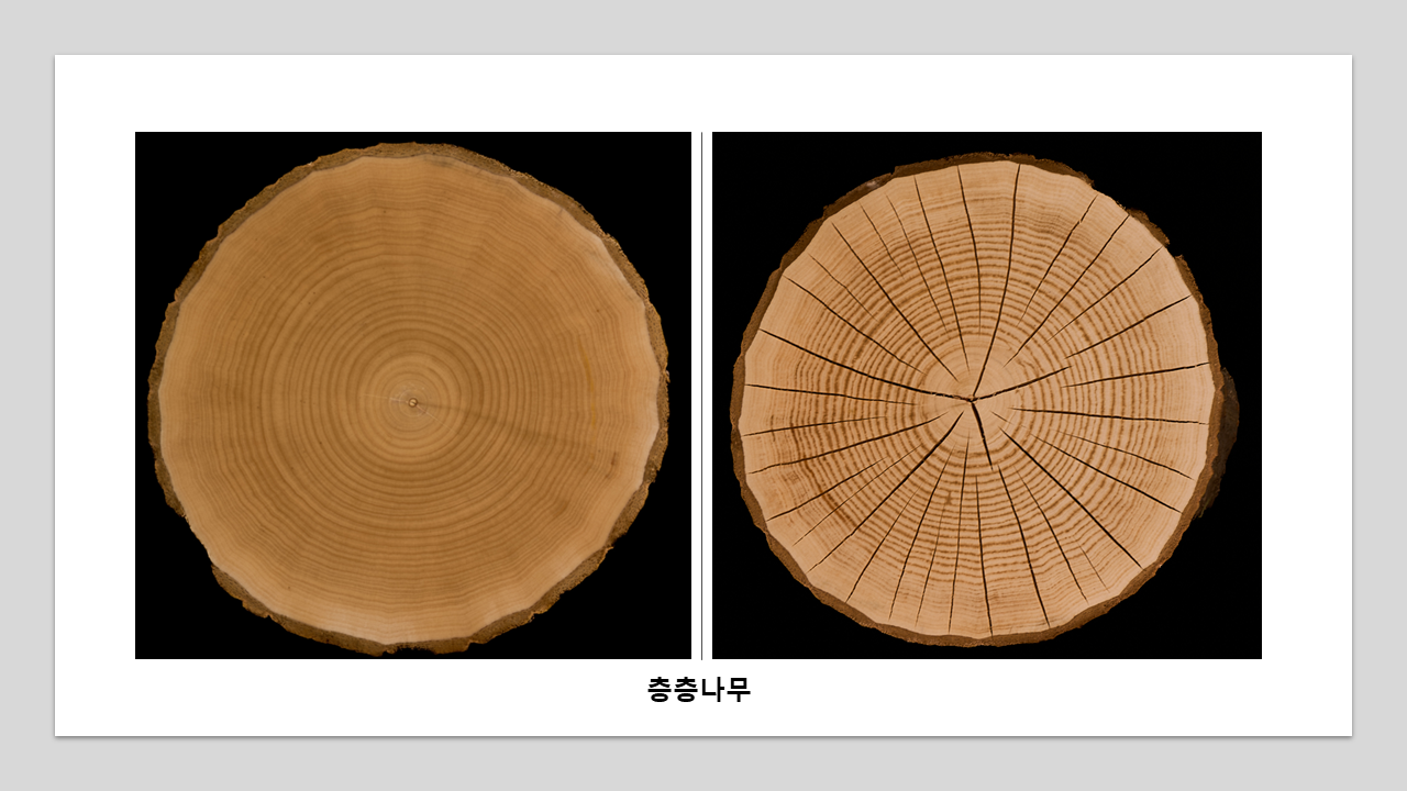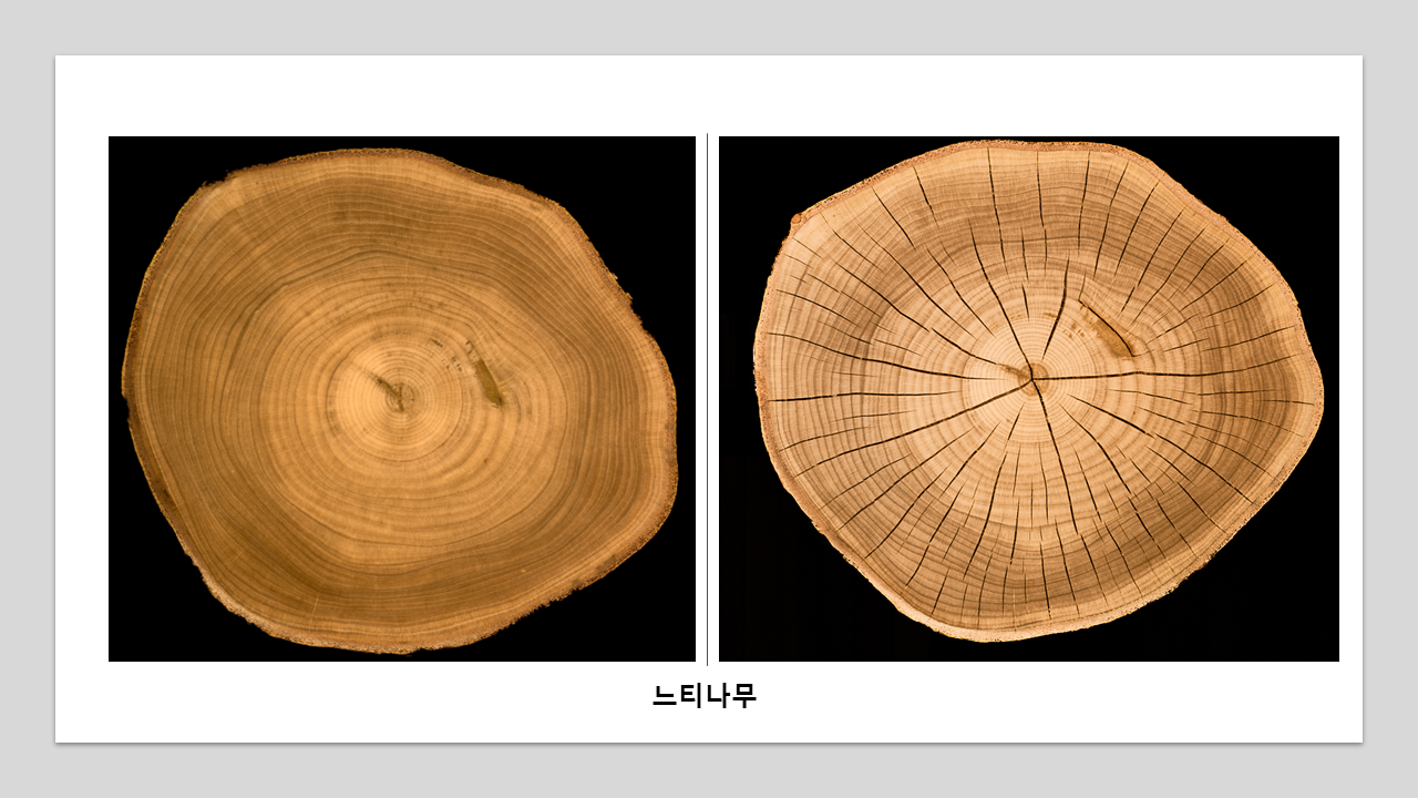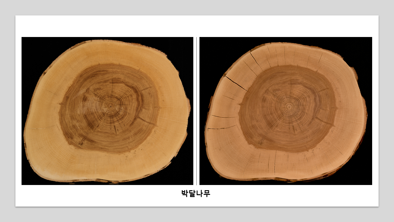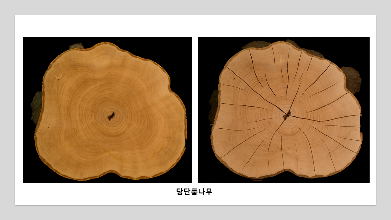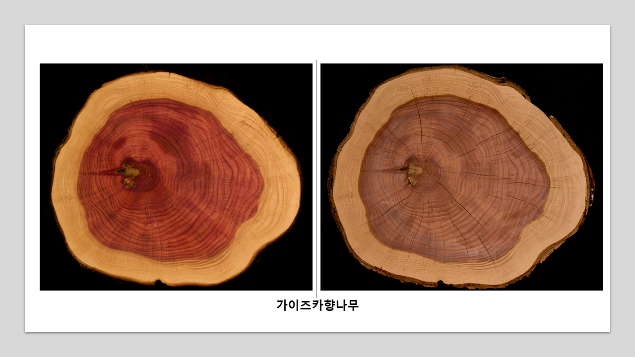 국산재의 원판 사진을 촬영하면서 관찰한 자료를 첨부한다. 원판은 생재를 샌딩하여 촬영하고 1주일이 경과한 후 할렬이 발생한 동일 원판 사진이다.